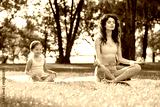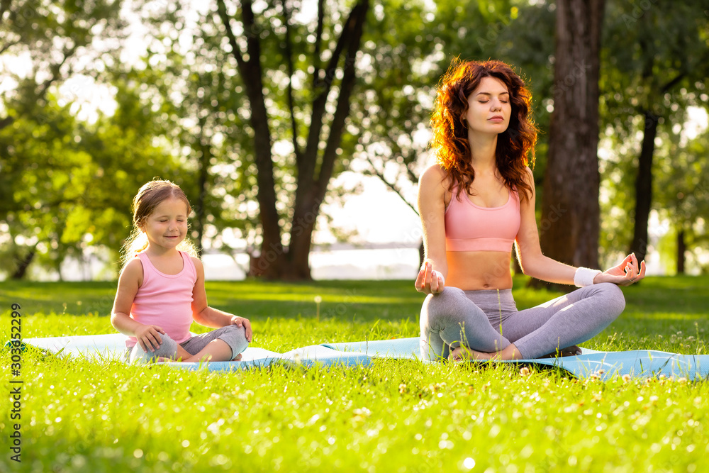 mother and daughter with closed eyes sitting in lotus positing together in the park