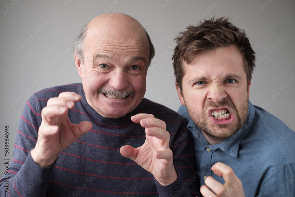 Angry mature father and son threating you lookign with dospleased expression at camera.