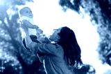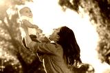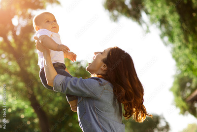 mother holding small son up on the hands in the park
