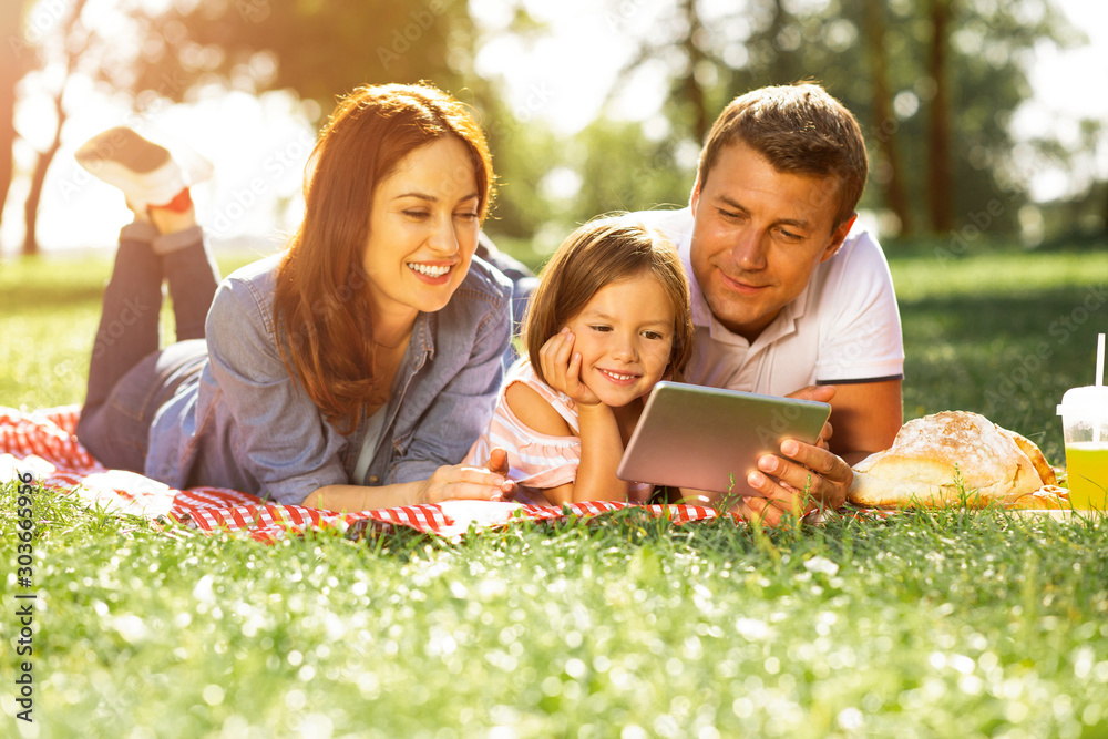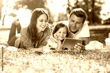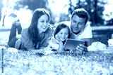 daughter, father anf mother using digital tablet while lying on the blanket in the park