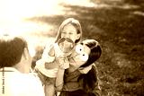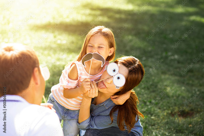 portrait of mother, father and daughter having fun together in the park using paper masks on the sticks