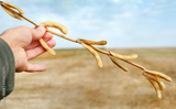 grain of soybeans in farmer's hand at harvest autumn time