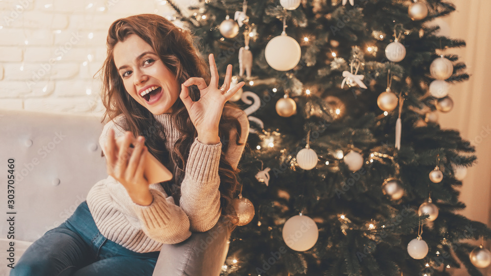 Woman with phone gesturing okay symbol sitting on the sofa near Christmas tree in the decorative interior. Positive gesture. Christmas and New Year photo.