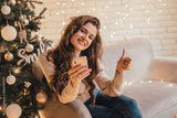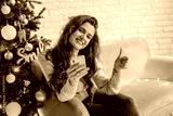 Woman with phone showing thumbs up sitting on the sofa near Christmas tree in the decorative interior. Positive gesture. Christmas and New Year photo.