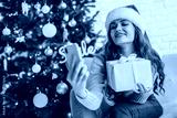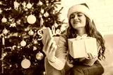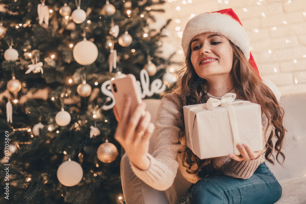 Woman in santa hat hugging presents and taking selfie sitting on the floor near Christmas tree in the decorative interior. Christmas and New Year photo.