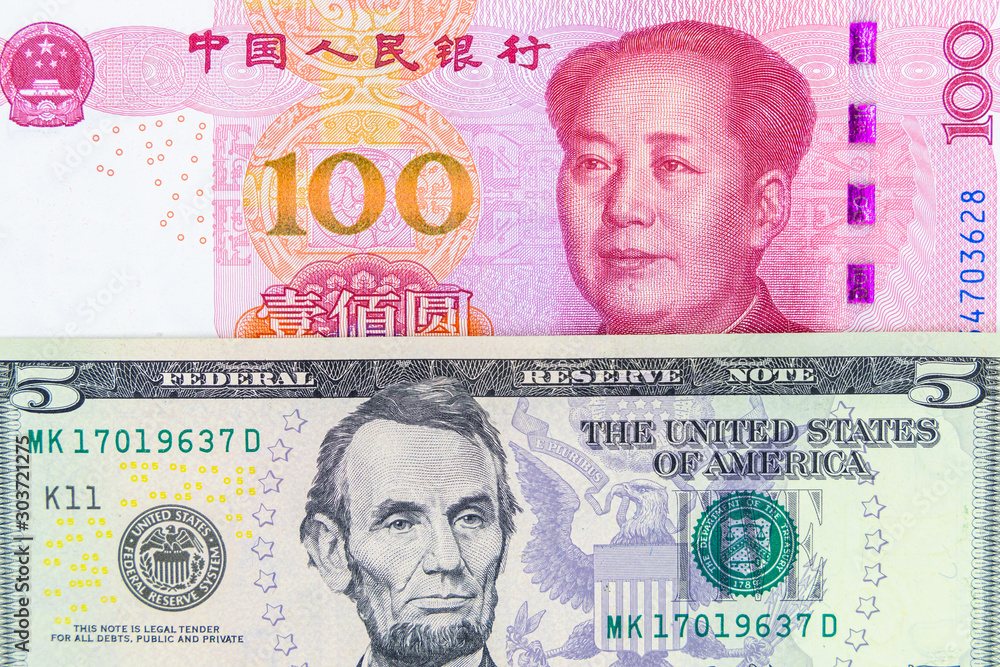 Chinese paper currency Yuan renminbi bill banknotes on white background, Banknote one hundred yuan, More chinese yuan background, China or economy of Asia growth, US trade war concept.