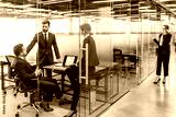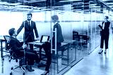 Group of strictly dressed business people having a discussion, sitting at the workplace with a computer in the modern office with glass partitions