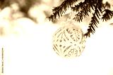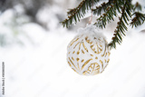 Decorated with golden ornaments Christmas tree on snow background. Merry Christmas and Happy Holidays greeting card. New Year. Noel. Winter xmas theme. Outdoor