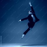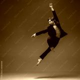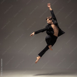 Man in casual office style clothes jumping and dancing isolated on grey background. Art, motion, action, flexibility, inspiration concept. Flexible caucasian ballet dancer, weightless jumps.