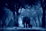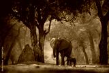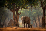 Elephant with young baby. Elephant at Mana Pools NP, Zimbabwe in Africa. Big animal in the old forest, evening light, sun set. Magic wildlife scene in nature. African elephant in beautiful habitat.
