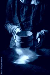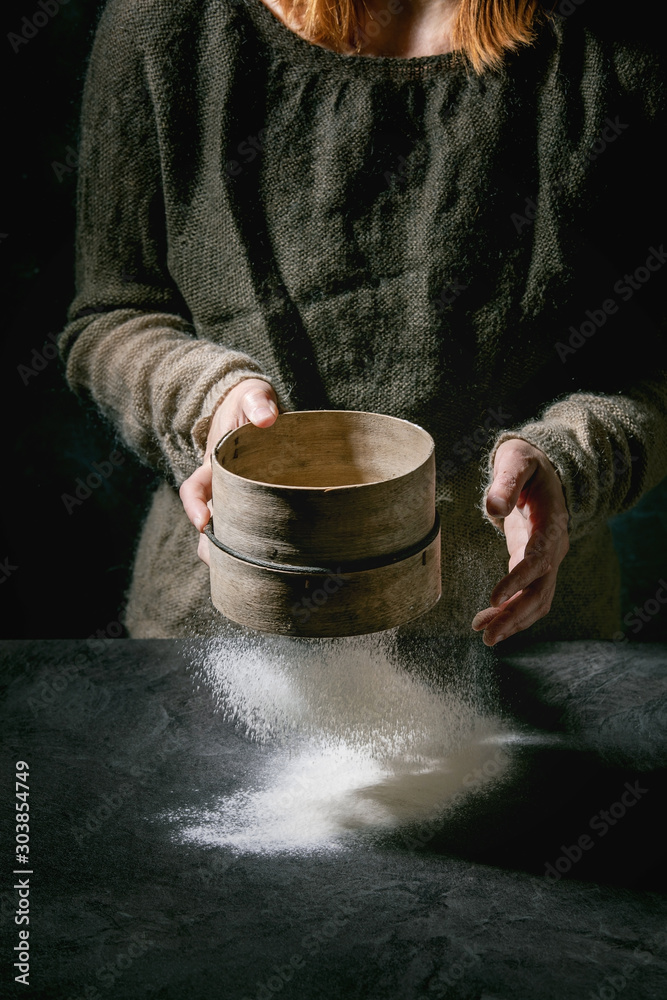 Process of making homemade bread dough. Woman hands sifts flour from vintage sieve on dark kitchen. Black table with flour. Home bread baking. Photo series.