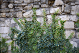 A wall of natural stones with climbing green plants on it. Natural beautiful background.