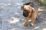 A small cute puppy plaintively looks up. Small pet-the concept of stray dogs.