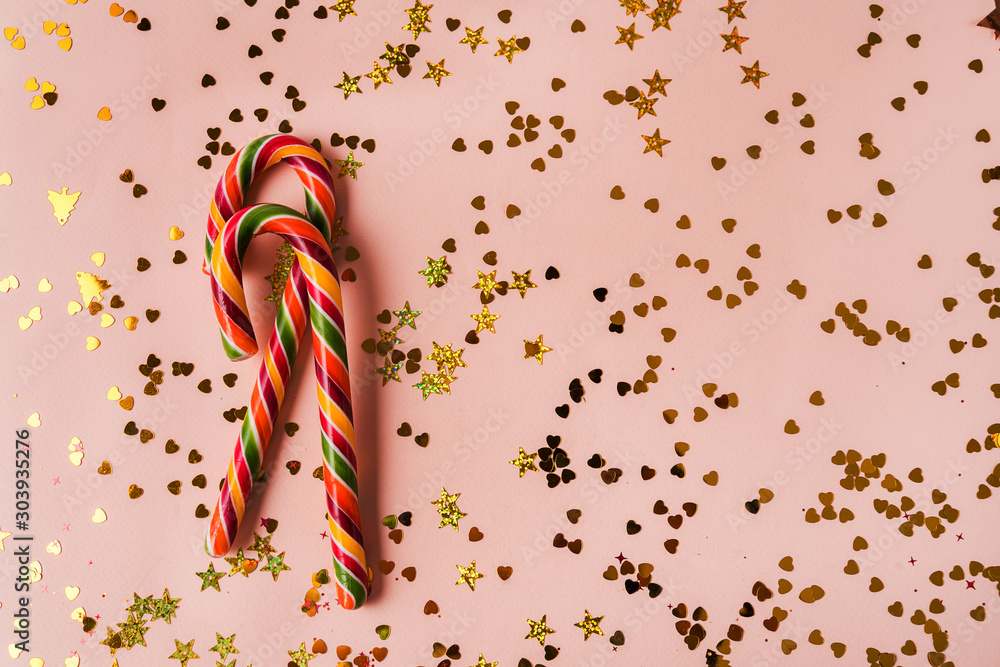 Festive Christmas background with candy cane and colorful confetti on pink background,