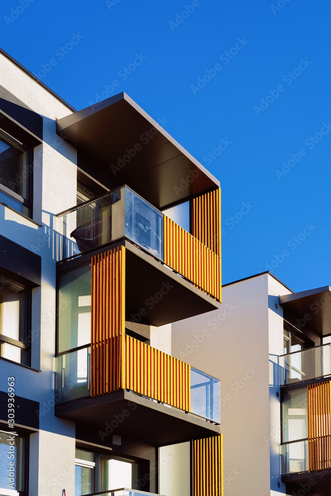 Residential apartment house facade with a blank place for the copy space. Blue sky on the background.