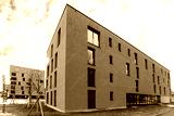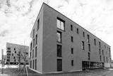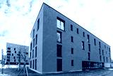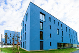 Colorful Modern residential apartment and flat building exterior in Salzburg, Austria. New luxury house and home complex of blue color. City Real estate property and condo architecture.