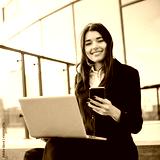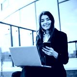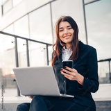 Successful smiling businesswoman or entrepreneur using laptop and phone sitting in front of his office.