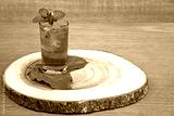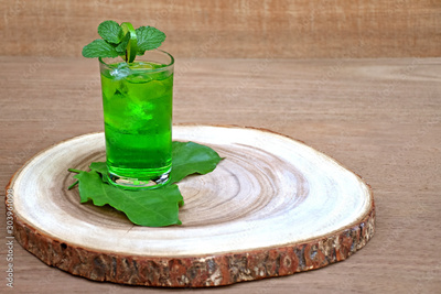Cold and refreshing lime and mint green water in a glass on wooden background.