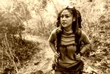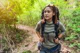 woman traveler with backpack looking to the side walking in the forest