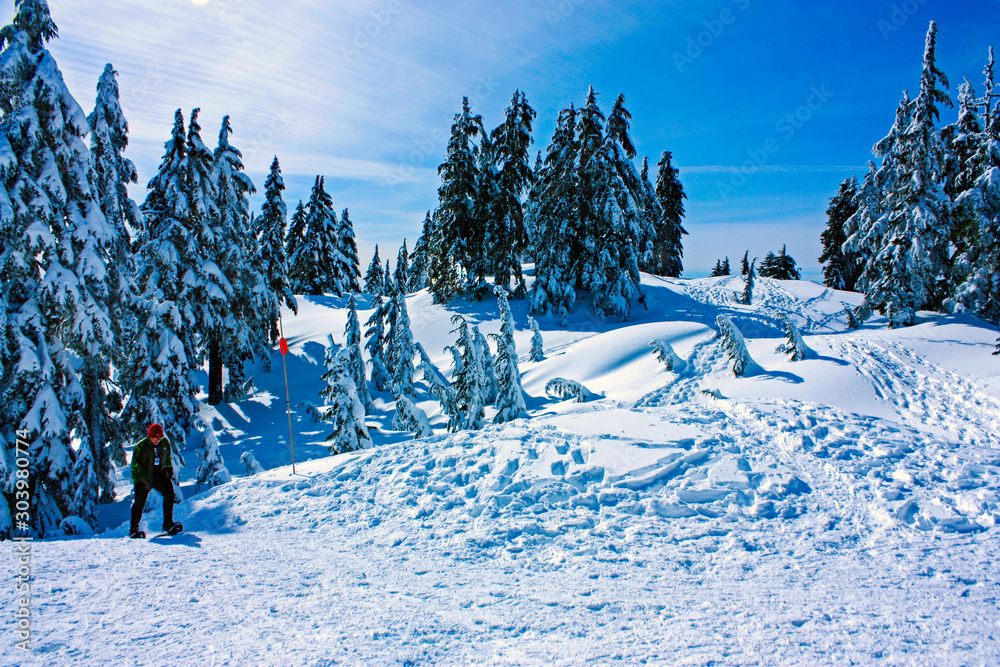 Snowshoeing on Snowshoe Grind above Grouse Mountain on a bright and sunny Winter day