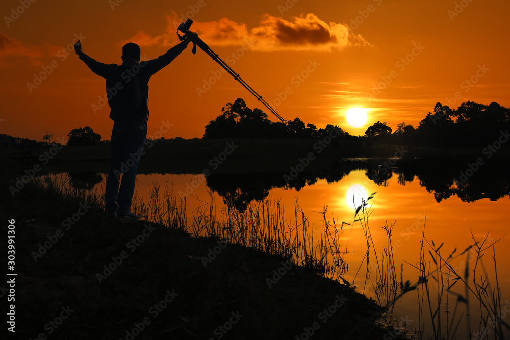 Photographer taking pictures outdoors, silhouette of a man with camera over sunset