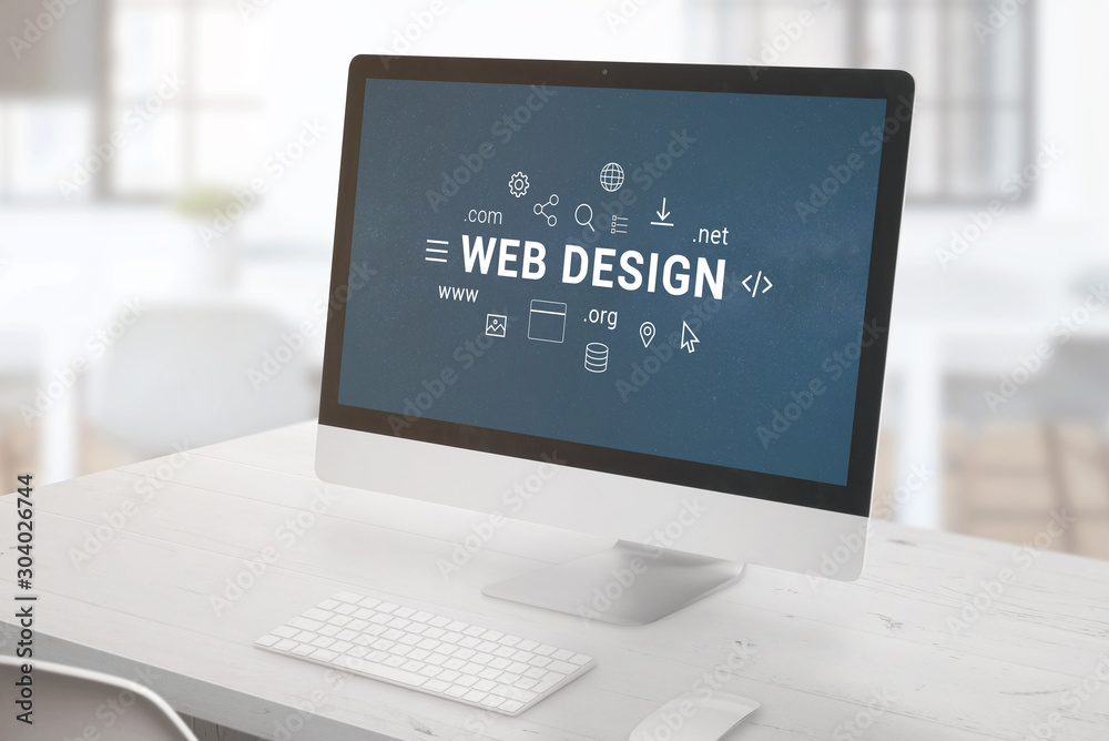 Computer display with web design text and web page, app graphic elements. Web design studio clean work desk.