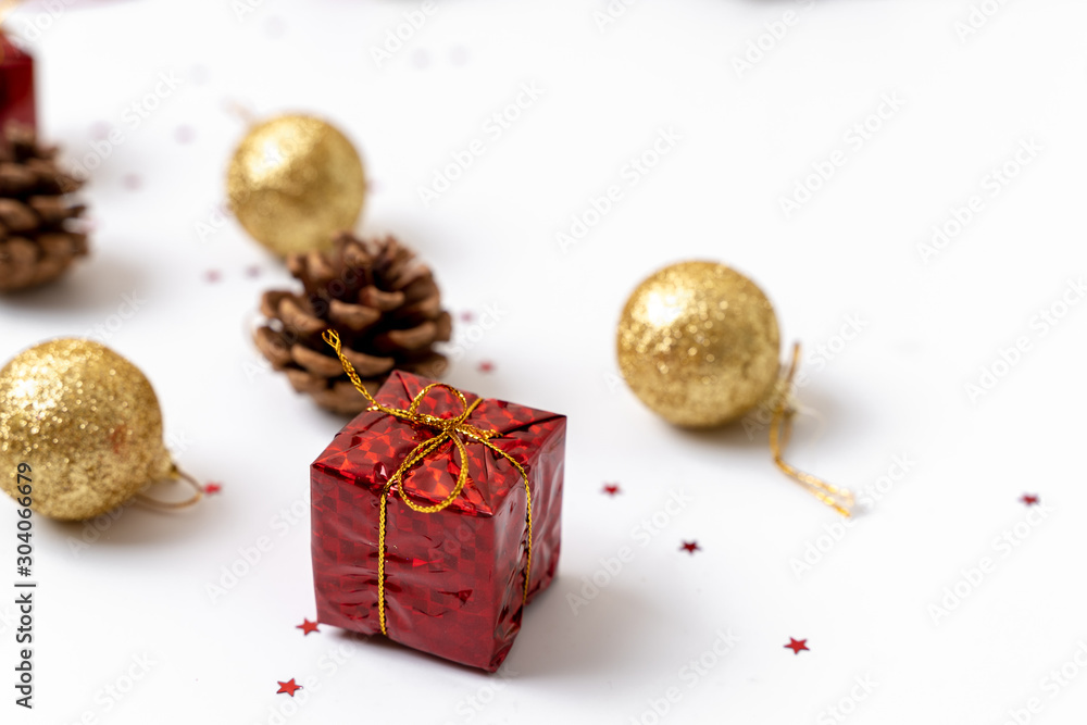 Christmas composition. Postcard, fir tree branches, red and green decorations. Flat lay, top view