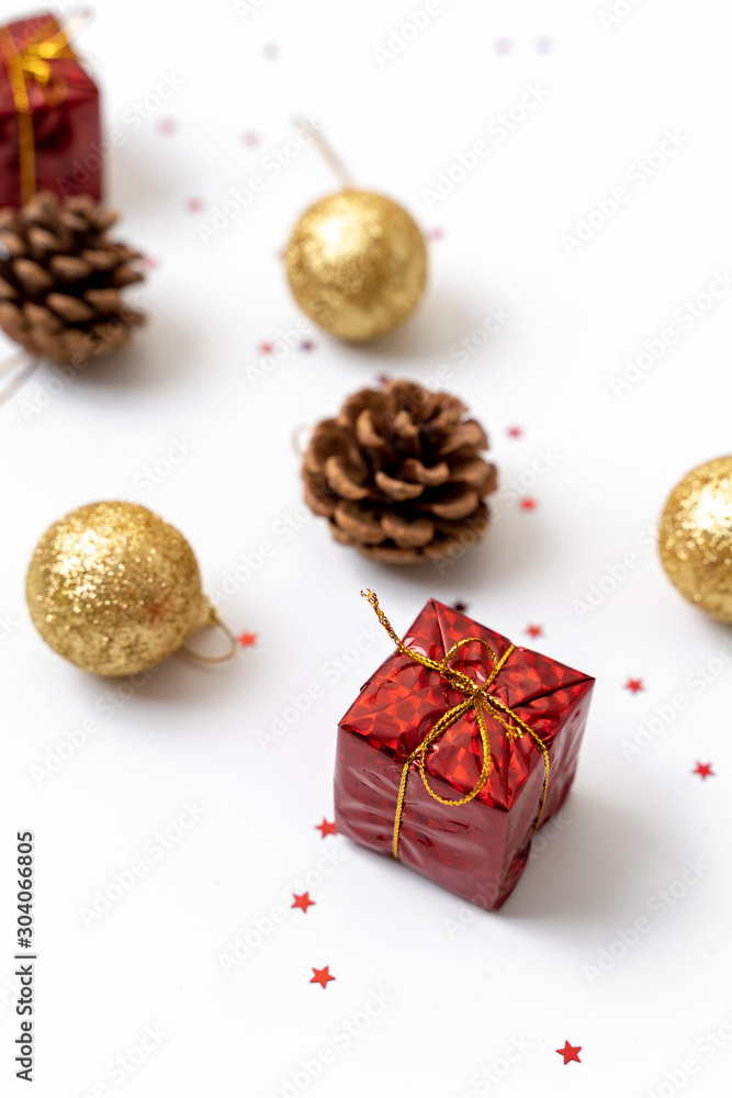 Christmas composition. Postcard, fir tree branches, red and green decorations. Flat lay, top view