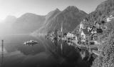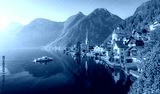 Classic panoramic view of famous old town Hallstatt and alpine deep blue lake with tourist ship in scenic golden morning light on a beautiful sunny day at sunrise in summer, Salzkammergut, Austria