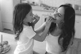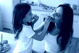 portrait of mother and daughter feeding each other with biscuits on the kitchen