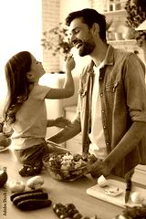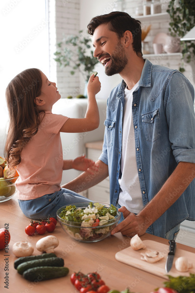 happy father and daughter tasting freshly prepared salad on the kitchen