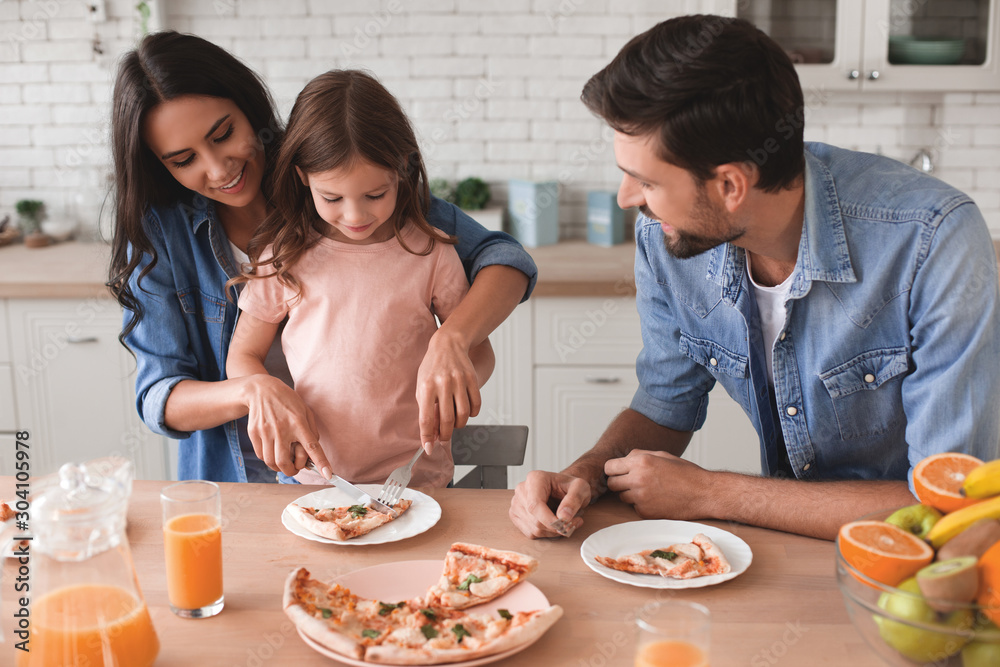 mother teaching daughter using cutlery for food while father looking in the kitchen