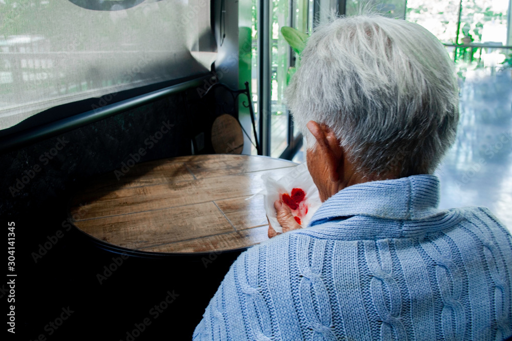 Old person coughing blood covering mouth with a tissue. She has flu, allergy symptoms, acute bronchitis, pulmonary infections or pneumonia. Concept: respiratory infections and healthcare.