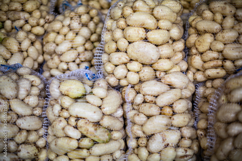 Potatoes storage on a farm. Freshly harvested and washed potatoes in big net bags in a warehouse.