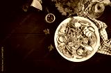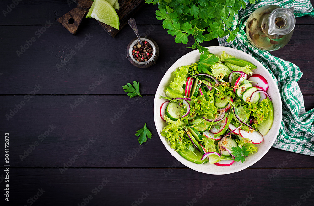 Healthy vegan food. Vegetarian vegetable salad of radish, cucumbers, lettuce and red onion. Top view, copy space