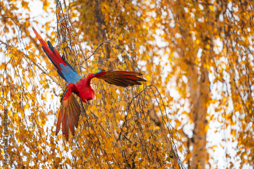 Tropical parrot flying down from the tree. Scarlet macaw with spread wings.