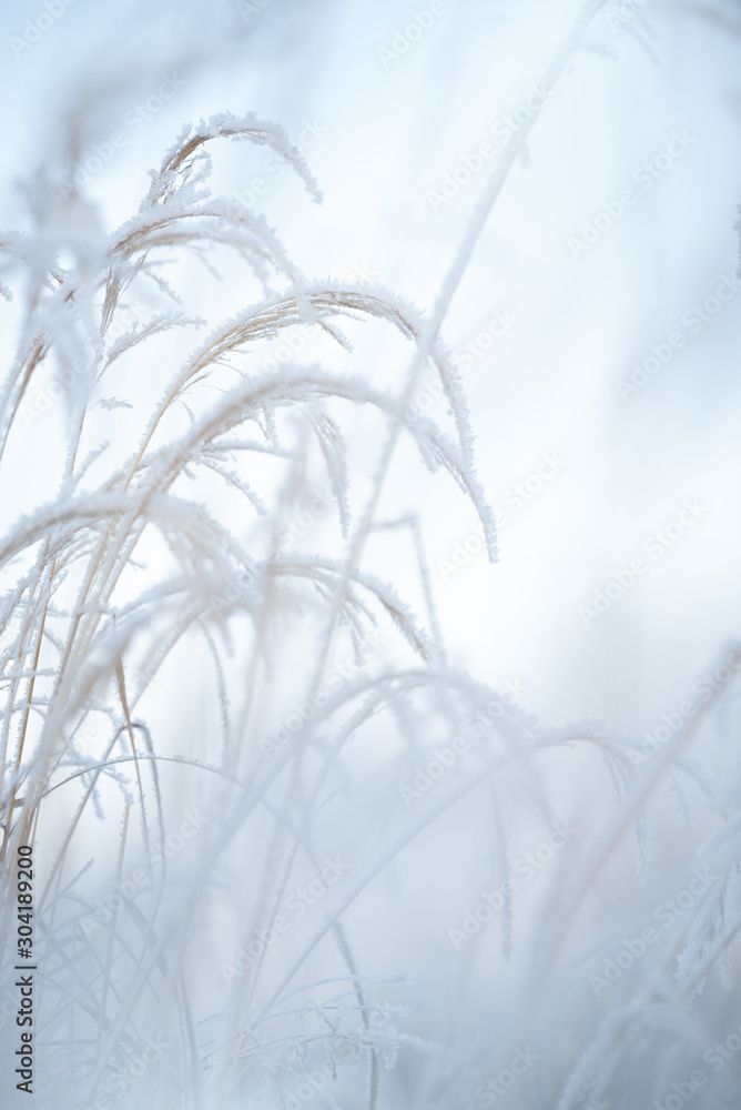 Frost covered grasses in winter landscape, selective focus and shallow depth of field