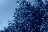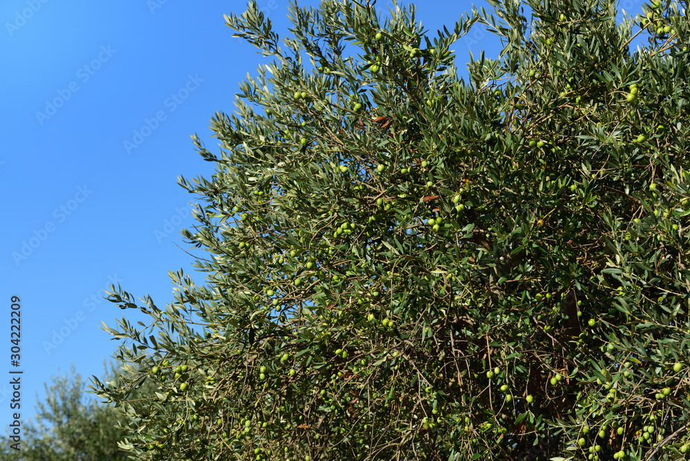 Branches, branches and leaves of an olive tree with green olives, against a blue sky with background on Sicily in autumn