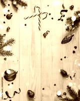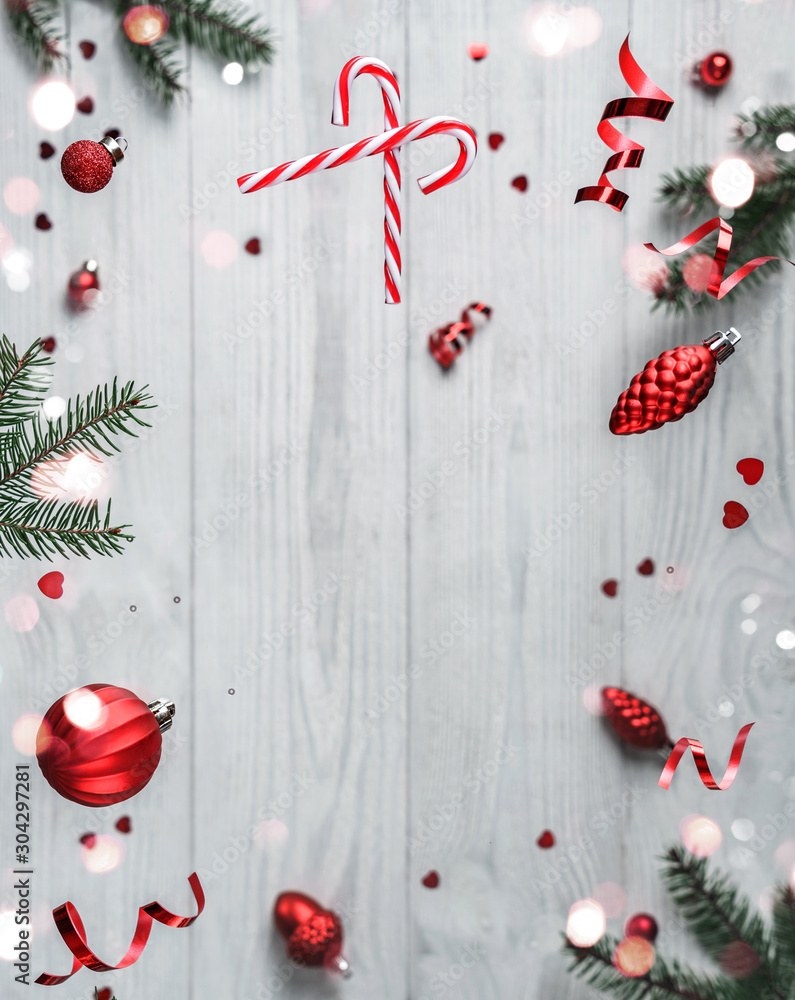 Merry Christmas and New Year background. Xmas holiday card made of flying decorations, fir branches, red balls, snowflakes, sparkles, bokeh, light on wooden background. Selective focus