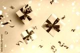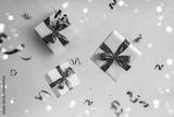 Merry Christmas and New Year background. Xmas holiday card made of flying decorations, red balls, snowflakes, sparkles, gift boxes, bokeh, light on pink background. Selective focus
