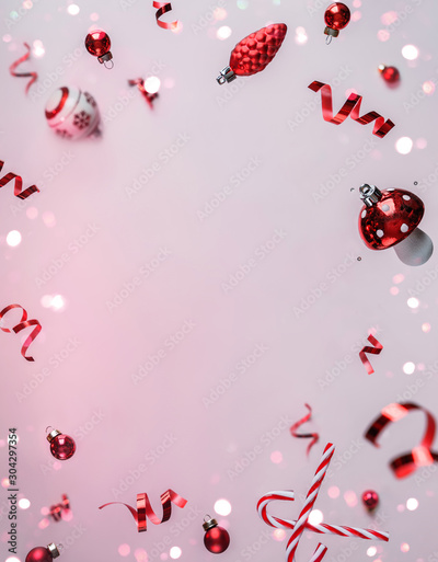 Merry Christmas card made of flying decorations, red decor, balls, sparkles and confetti on light pink background. Xmas and New Year holiday, bokeh, light. Selective focus