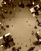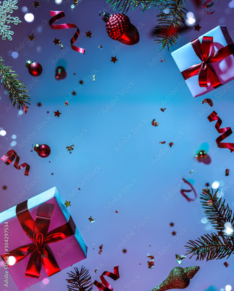 Merry Christmas and New Year background. Xmas holiday card made of flying decorations, fir branches, balls, snowflakes, sparkles, gift boxes, bokeh on colorful neon blue and purple background