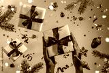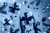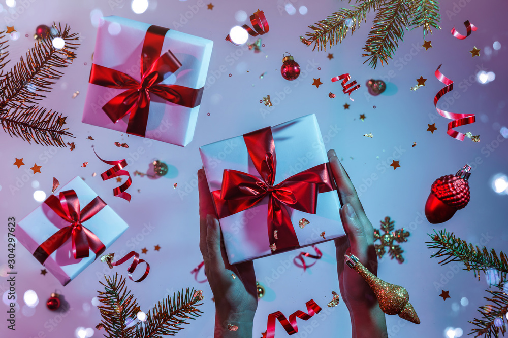 Female hands holding gift box on colorful bright neon blue and purple background with flying Christmas decorations, fir branches and confetti. Xmas and New Year holiday, bokeh, light. Selective focus