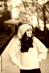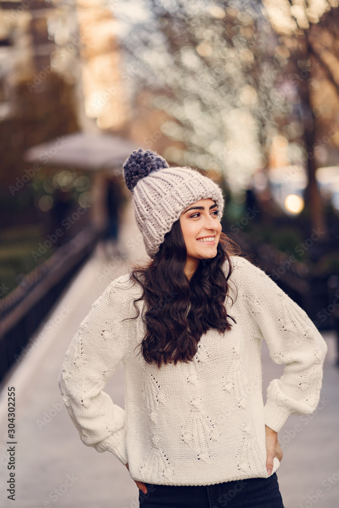 Elegant girl walk in a winter city. Woman in a white knited sweater. Beautiful lady with dark hair.