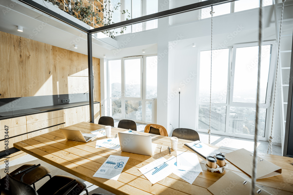 Workplace with large wooden table and office supplies with no people in bright sunny office room, wide interior view