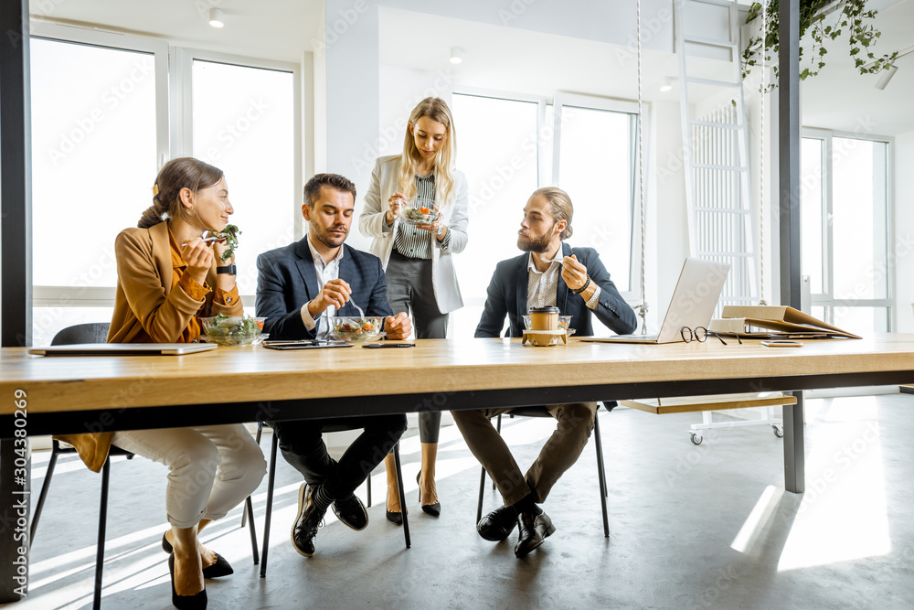 Group of a young office workers eating salads and drinking coffee at the modern office canteen. Concept of a healthy takeaway food on the work