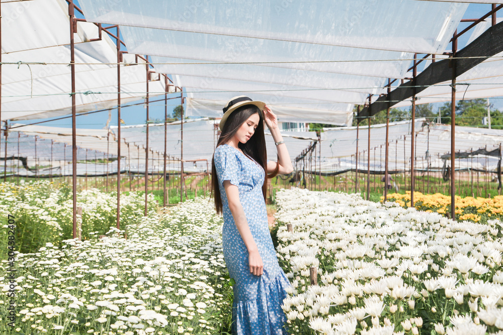Portrait young beautiful asian woman in blue dress relaxing at chrysanthemum flower field