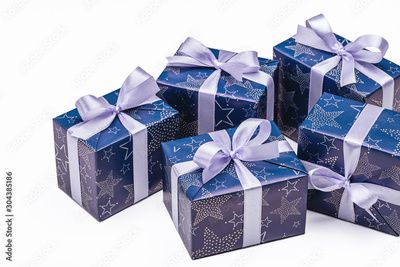 Lot of gift boxes on white background. Craft gifts and blue paper decorated with lilac satin ribbon bows. Christmas and other holidays concept.