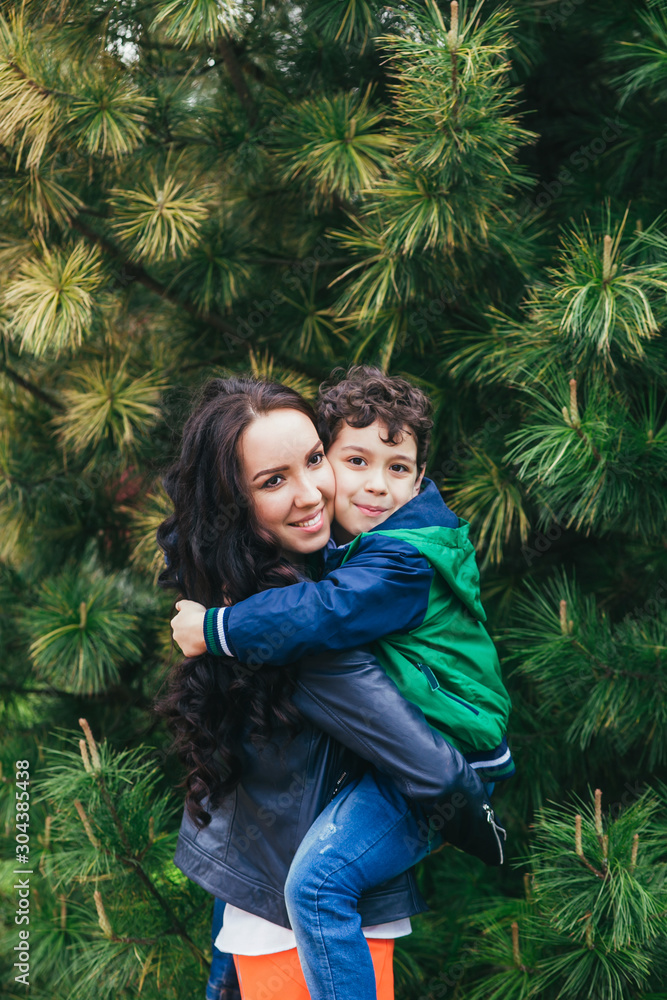 A happy mother holds her son in her arms. A mother's love and tenderness