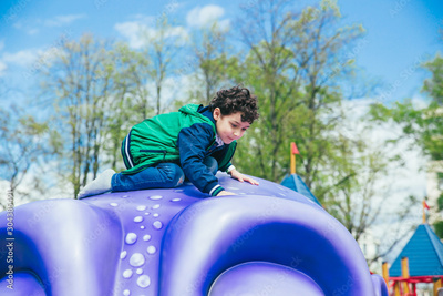 Little cute boy is having fun outdoor in summer. Playing in children zone in amusement park.